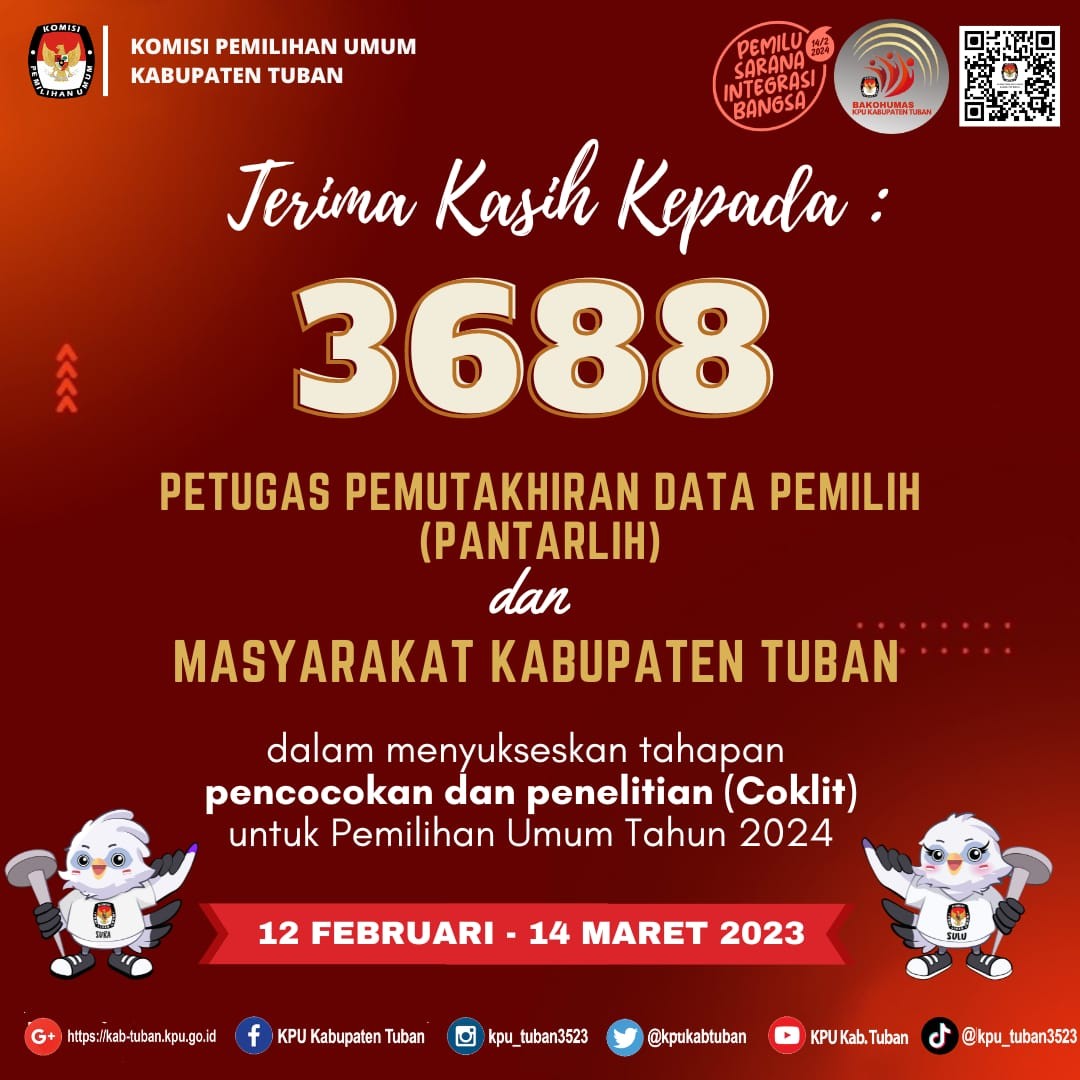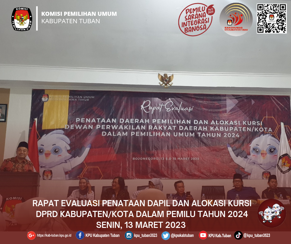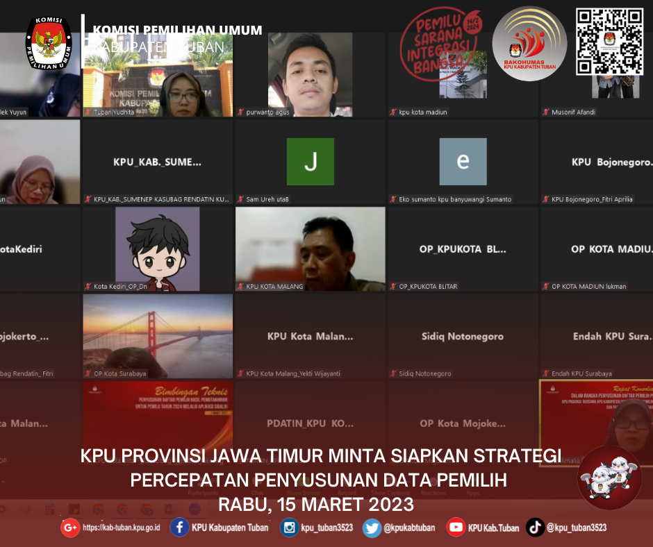 Tuban, kab-tuban.kpu.go.id - Divisi dan Kepala Sub Bagian Perencanaan, Data dan Informasi, serta Operator Sidalih KPU Kabupaten Tuban, mengikuti Rapat Koordinasi Penyusunan Daftar Pemilih Hasil Pemutakhiran Dalam Negeri Untuk Pemilu 2024 KPU Provinsi Jawa Timur beserta 38 KPU Kabupaten/Kota se-Jatim, pada Rabu (15/03/2023), mulai pukul 14.00 WIB sampai selesai. Rapat terselenggara secara daring untuk melakukan koordinasi rutin penyusunan daftar pemilih Pemilu 2024. "Siapkan strategi-strategi percepatan penyusunan data pemilih hasil sinkronisasi dan pastikan tidak ada kekeliruan data pemilih yang diunggah ke sidalih," tegas Nurul mengawali rapat daring tersebut. Nurul berpesan kepada Tim Data Pemilih se-Jawa Timur agar mengontrol betul kinerja PPK (Panitia Pemilihan Kecamatan) dalam proses unggah ke sidalih dan mengawal penyusunan data pemilih sesuai alur dari pantarlih ke PPS (Panitia Pemungutan Suara) sampai ke PPK dan unggah data. Setelah kegiatan coklit selesai, instruksikan Pantarlih untuk membuat peta wilayah yang dicoklitnya dengan bantuan teknologi informasi. "Buku kerja Pantarlih juga nanti disimpan di KPU kabupaten/kota untuk menjaga kerahasiaan data pribadi pemilih," tukas Nurul. Pada rakor tersebut, Kepala Sub Bagian Data dan Informasi KPU Provinsi Jawa Timur, Agus Purwanto, membuka sesi tanya jawab seputar teknis sidalih dan permasalahan-permasalahannya. Agus mengingatkan agar lebih sering menjalin komunikasi dengan berbagai pihak agar data pemilih yang dihasilkan valid. (dy/humas)