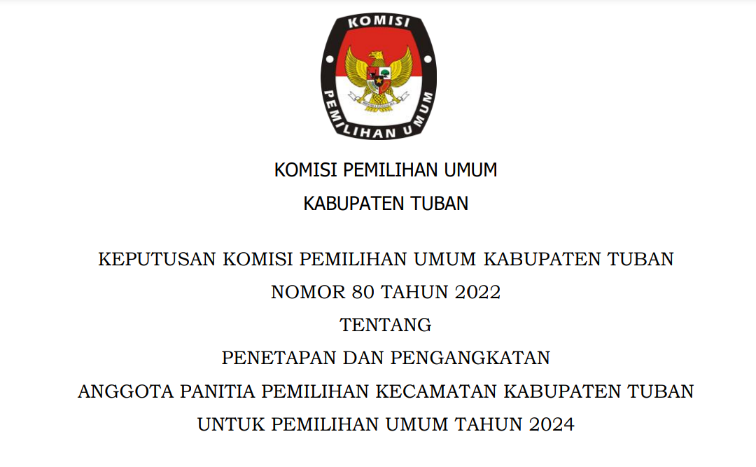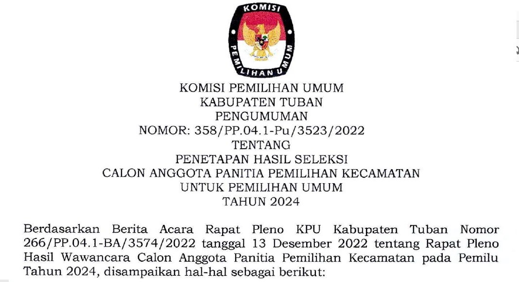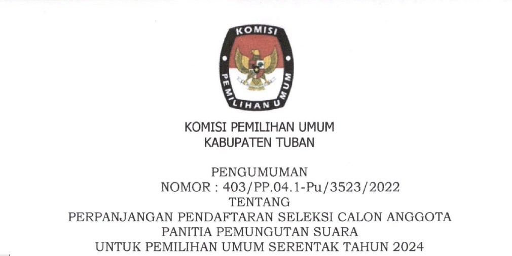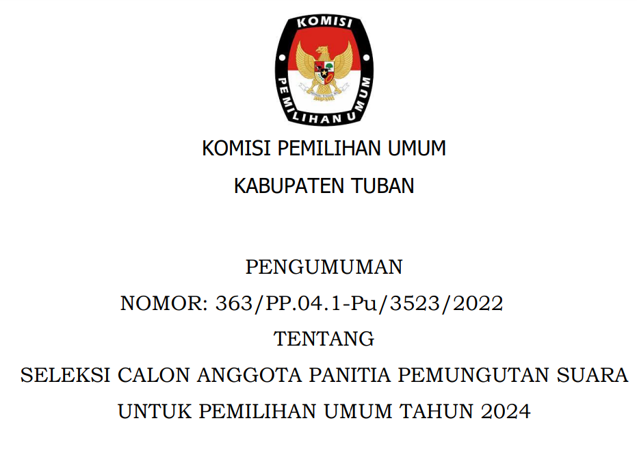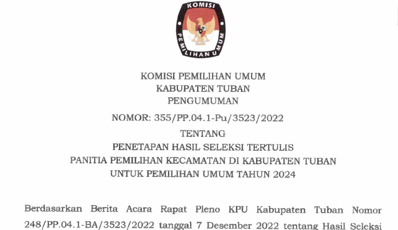 PENGUMUMAN HASIL SELEKSI TERTULIS PPK PEMILU TAHUN 2024 Kamis, 08 Desember 2022 18:30 2543 kab-tuban.kpu.go.id - Pengumuman Hasil Seleksi Tertulis PPK di Kab. Tuban untuk Pemilu Tahun 2024 Baca Selengkapnya