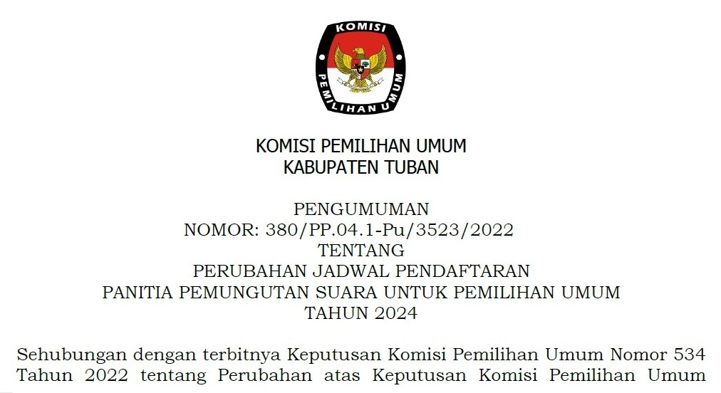 PENGUMUMAN PERUBAHAN JADWAL PENDAFTARAN PPS UNTUK PEMILU 2024 Jumat, 23 Desember 2022 07:00 2800 kab-tuban.kpu.go.id - Pengumuman Perubahan Jadwal Pendaftaran PPS Pemilu 2024 -- Dokumen Pendaftaran PPS Pemilu 2024 Baca Selengkapnya
