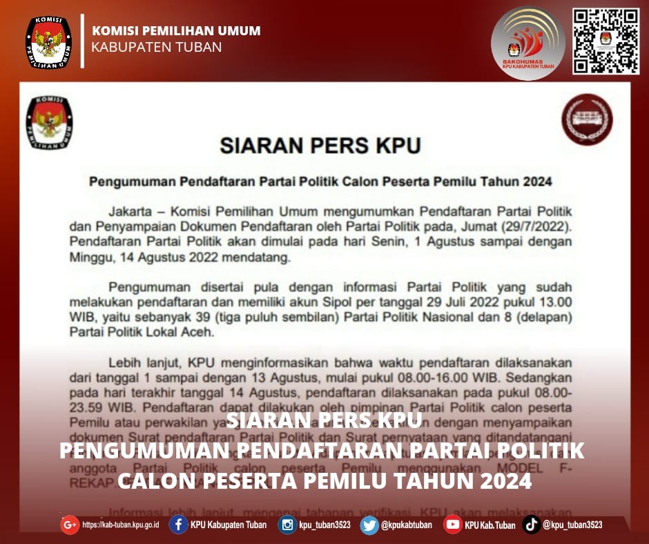 Jakarta – Komisi Pemilihan Umum mengumumkan Pendaftaran Partai Politik dan Penyampaian Dokumen Pendaftaran oleh Partai Politik pada, Jumat (29/7/2022). Pendaftaran Partai Politik akan dimulai pada hari Senin, 1 Agustus sampai dengan Minggu, 14 Agustus 2022 mendatang. Rilis selengkapnya dapat diunduh berikut ini Siaran Pers KPU Terkait Pengumuman Pendaftaran Partai Politik Calon Peserta Pemilu 2024