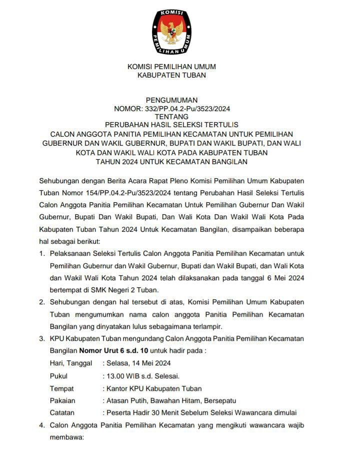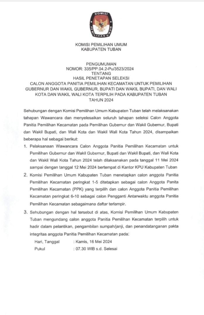 dan Keputusan Nomor 348/PP.04.2-Pu/3523/2024 tentang Perubahan Hasil Penetapan Seleksi Calon Anggota Panitia Pemungutan Suara Untuk Pemilihan Gubernur dan Wakil Gubernur, Bupati dan Wakil Bupati, dan Wali Kota dan Wakil Wali Kota Pada Kabupaten Tuban Tahun 2024.