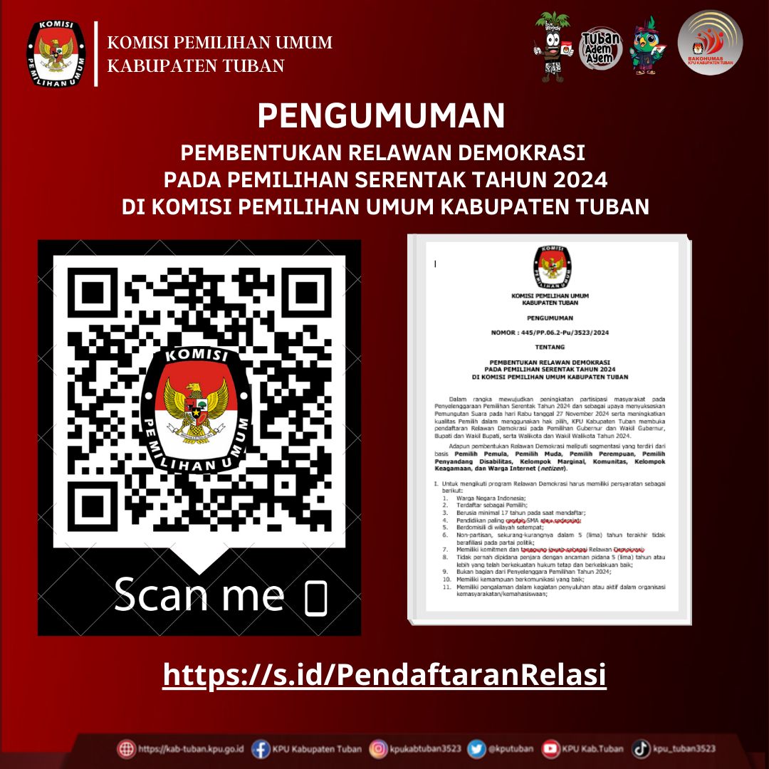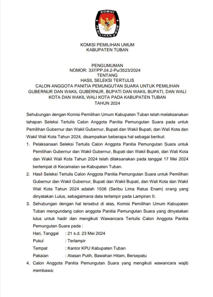 Tuban, kab-tuban.kpu.go.id - Berdasarkan Keputusan Nomor 347/PP.04.2-Pu/3523/2024 tentang Hasil Penetapan Seleksi Calon Anggota Panitia Pemungutan Suara Untuk Pemilihan Gubernur dan Wakil Gubernur, Bupati dan Wakil Bupati, dan Wali Kota dan Wakil Wali Kota Pada Kabupaten Tuban Tahun 2024.