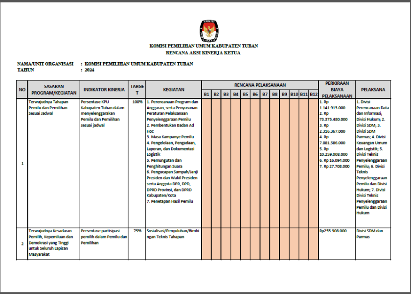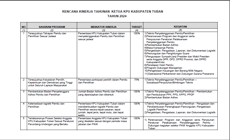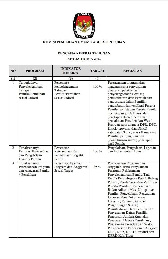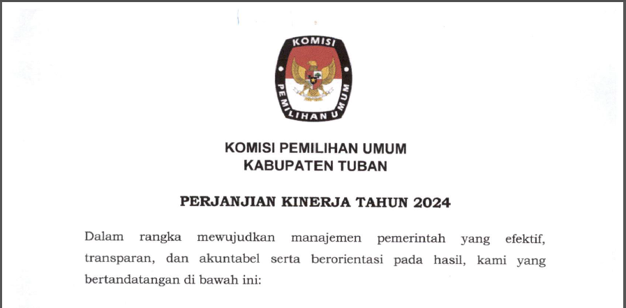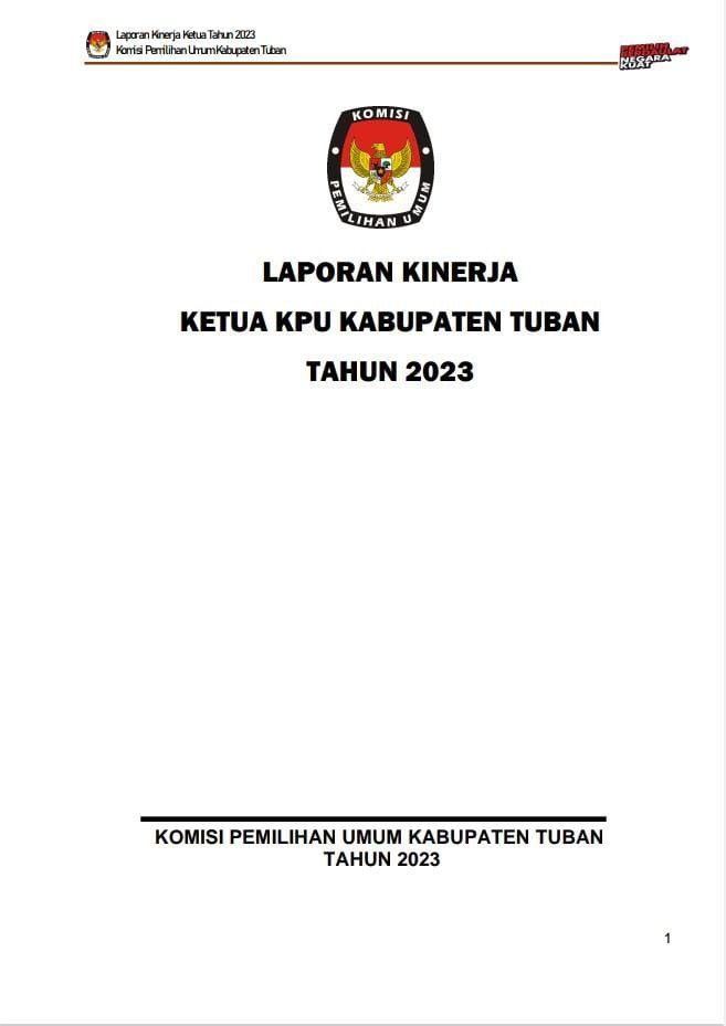 Laporan Kinerja Tahun 2024 Sekretaris Komisi Pemilihan Umum Kabupaten Tuban Selasa, 16 Januari 2024 14:12 37 Berikut kami sampaikan Laporan Kinerja Tahun 2024 Sekretaris Komisi Pemilihan Umum Kabupaten Tuban. Untuk selengkapnya dapat di download DISINI Baca Selengkapnya