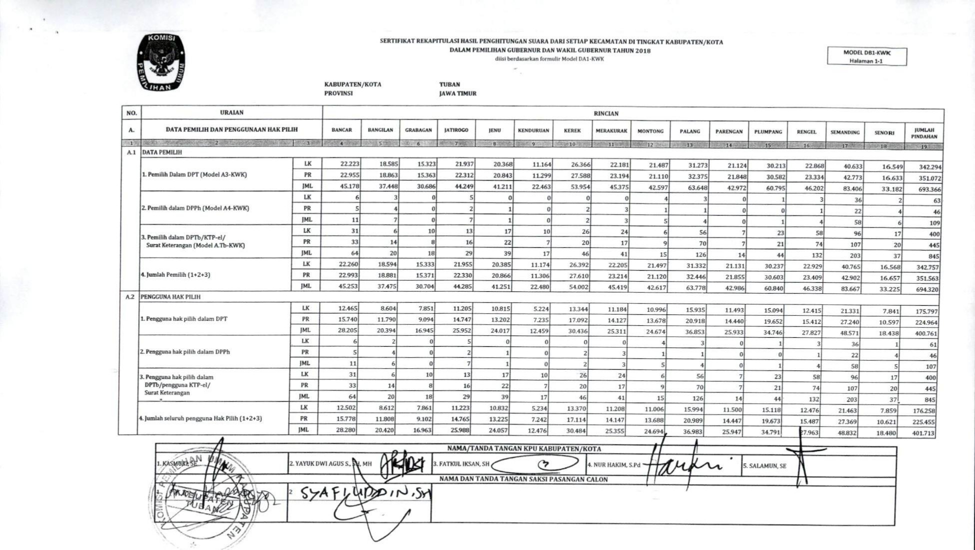 Rekapitulasi Penghitungan Suara Pemilihan Gubernur dan Wakil Gubernur Jawa Timur 2018 Tingkat Kabupaten Tuban (Form DB.1-KWK)
